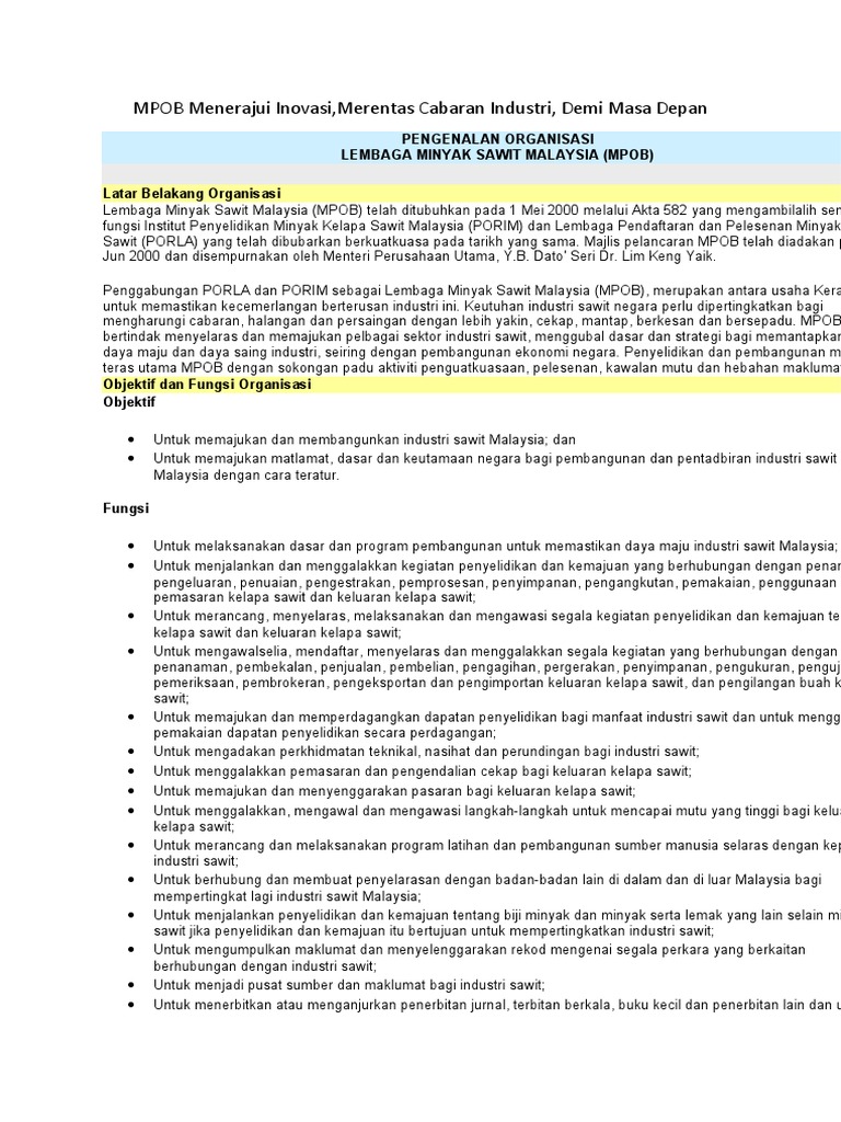 Lembaga minyak sawit malaysia is a government agency based in kajang, selangor. Malaysian palm oil board), disingkat mpob, adalah sebuah lembaga pemerintah yang bertanggung jawab untuk promosi dan pengembangan industri minyak sawit di. 1/2 borang permohonan skim tanam baru sawit pekebun kecil (tbspk) a. Ratusan jawatan kosong mpon lembaga minyak sawit malaysia (malaysian palm oil board). Permohonan adalah dipelawa daripada warganegara malaysia yang berkelayakan untuk berkhidmat di lembaga minyak sawit malaysia bagi permohonan hendaklah dikemukakan dengan menggunakan borang secara online yang boleh diperolehi dari laman web mpob di alamat: