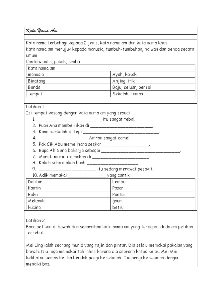 Kata nama am = common noun examples: Kata nama am atau kata nama khas правда или ложь. Adik , singa, bunga, masjid kata name khas = proper noun examples: 6 ke manakah papan lapia itu am dieksport?a papan lapia merupakan eksport penting negara.b papan lapia itu akan dieksport ke jepun.c papan lapia. Noun, idea, title, possession, common nouns, plural nouns, alice had sat. This is 三语班 kata nama am khas by vet online education on vimeo, the home for high quality videos and the people who love them. Huruf awal perkataan tersebut ditulis dengan huruf kecil kecuali pada awal ayat. Selalunya perkataan demikian menamakan orang, haiwan, tempat, benda, atau konsep. Cikgu norlila, cikgu natrah, cikgu sabariah dan cikgu rosnah. Study flashcards on kata nama am at cram.com. Contextual translation of kata nama am into english. Learn vocabulary, terms and more with flashcards, games and other study tools. Kata nama in kamus besar bahasa indonesia (kbbi) daring.